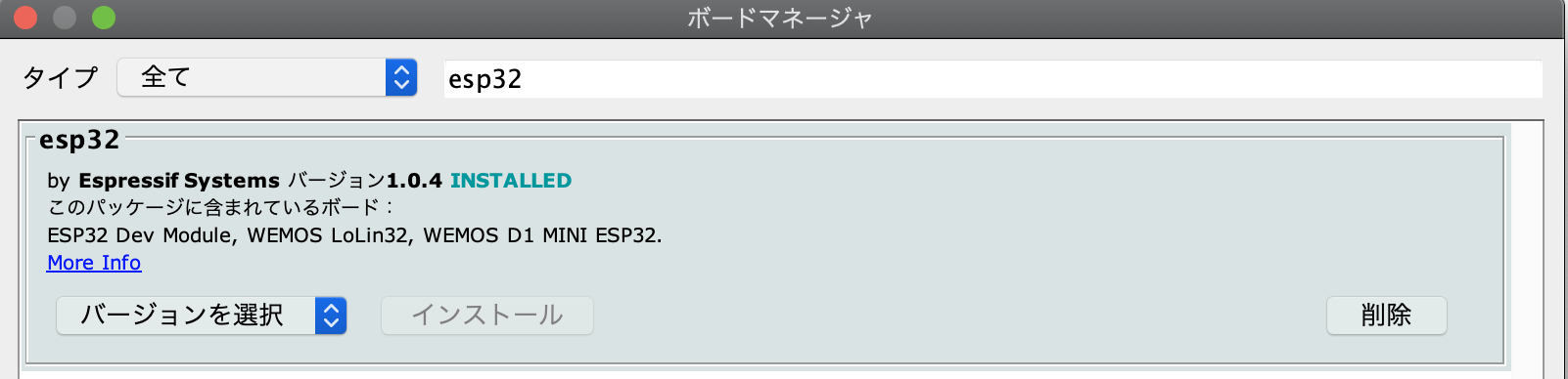 ボードマネージャでESP32と検索し,espressif/arduino-esp32をインストール