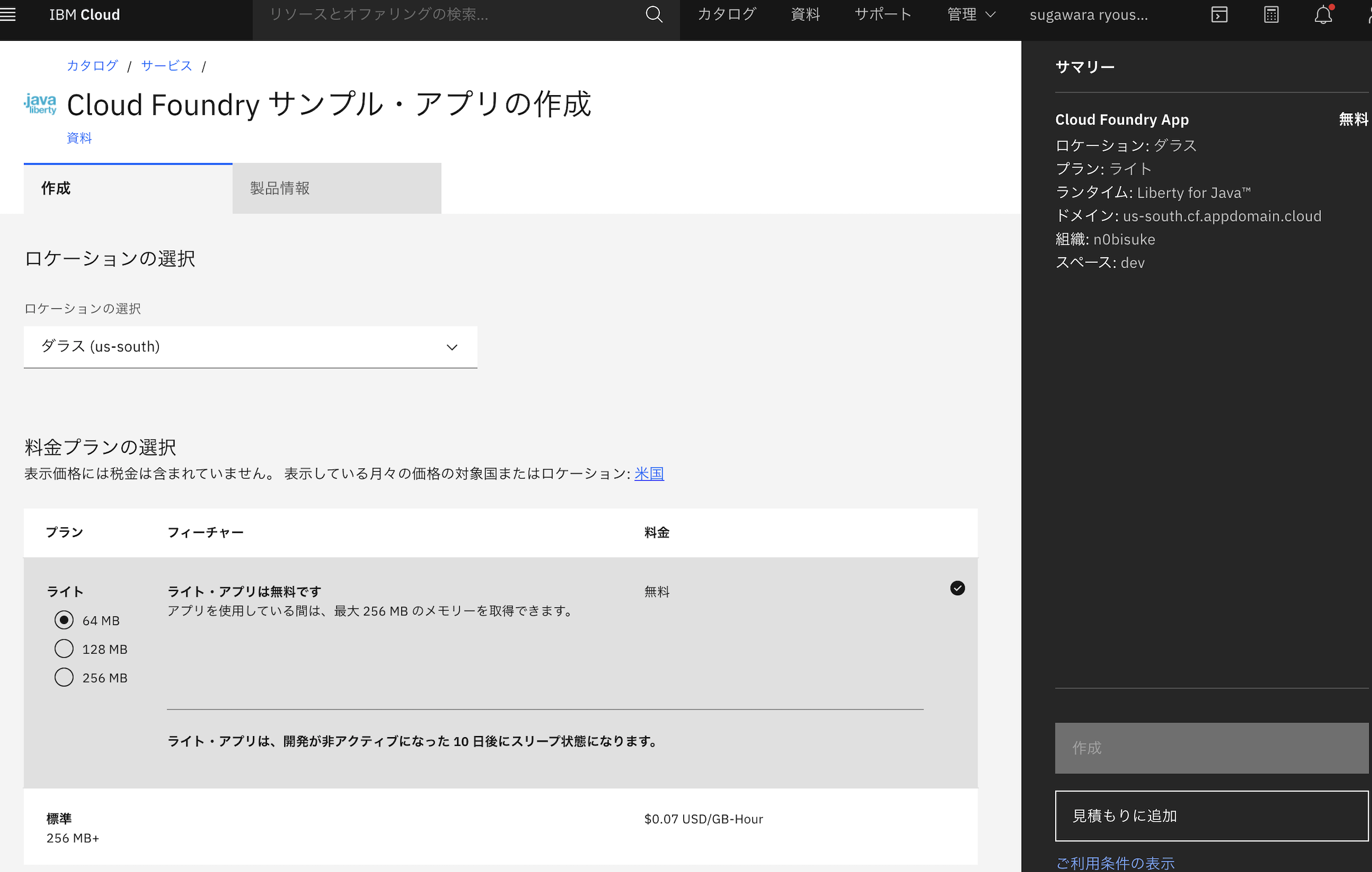 ロケーション(リージョン)選択は現状だと、ダラス(us-south)以外は無料枠では利用できない模様です。ダラスを選択します。