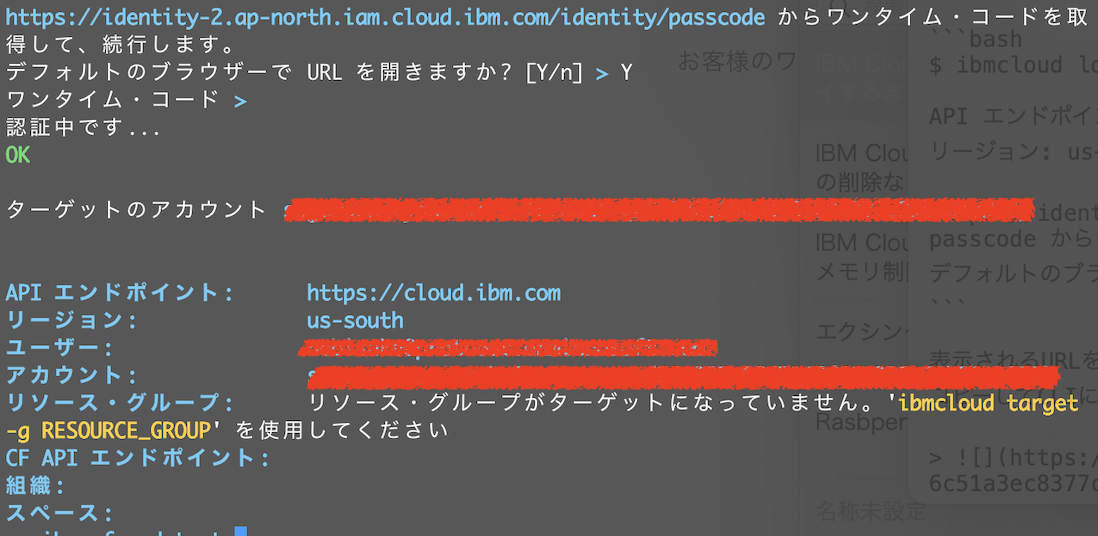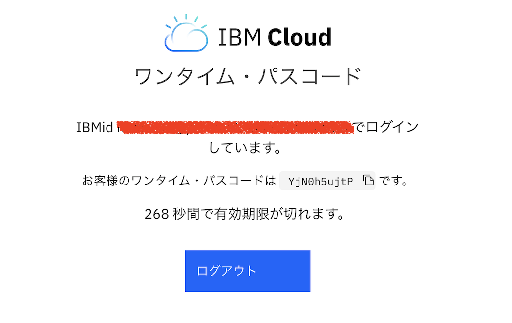 https://identity-2.ap-north.iam.cloud.ibm.com/identity/passcode からワンタイム・コードを取得して、続行します。